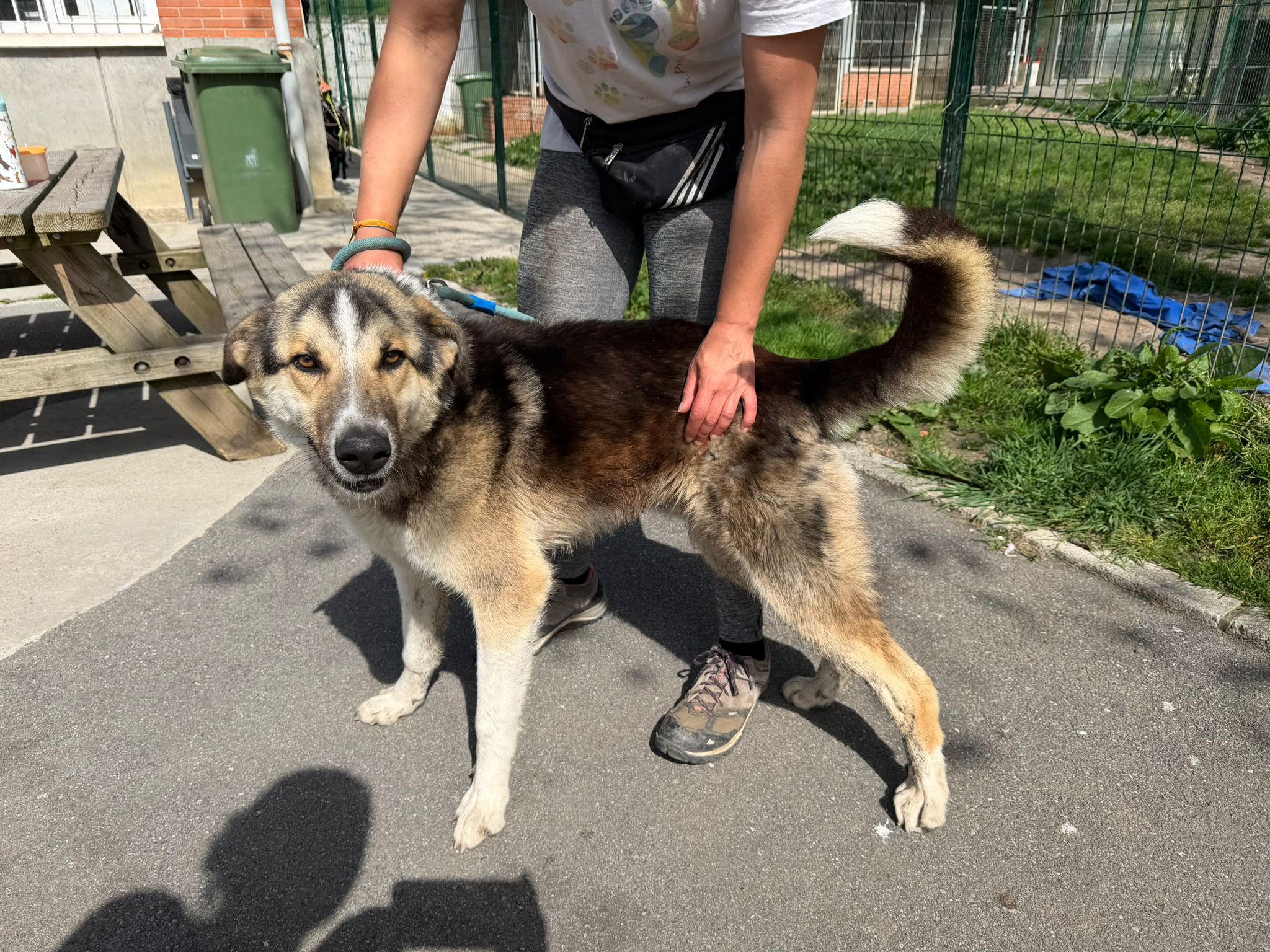 Mochi on ihana ja kiltti uroskoira jolla on ollut tähän asti haastava elämä. Pentuikänsä hän on elänyt talon pihassa lyhyeen ketjuun kytkettynä ja hyvin vähällä ruokinnalla. Mochi on vasta 8 kk ikäinen ja painoa hänellä on 25 kg ja säkä on tällä hetkellä 63 cm (Mochi kasvaa ja kerää massaa vielä, oletettu aikuispaino on noin 35-40 kg)